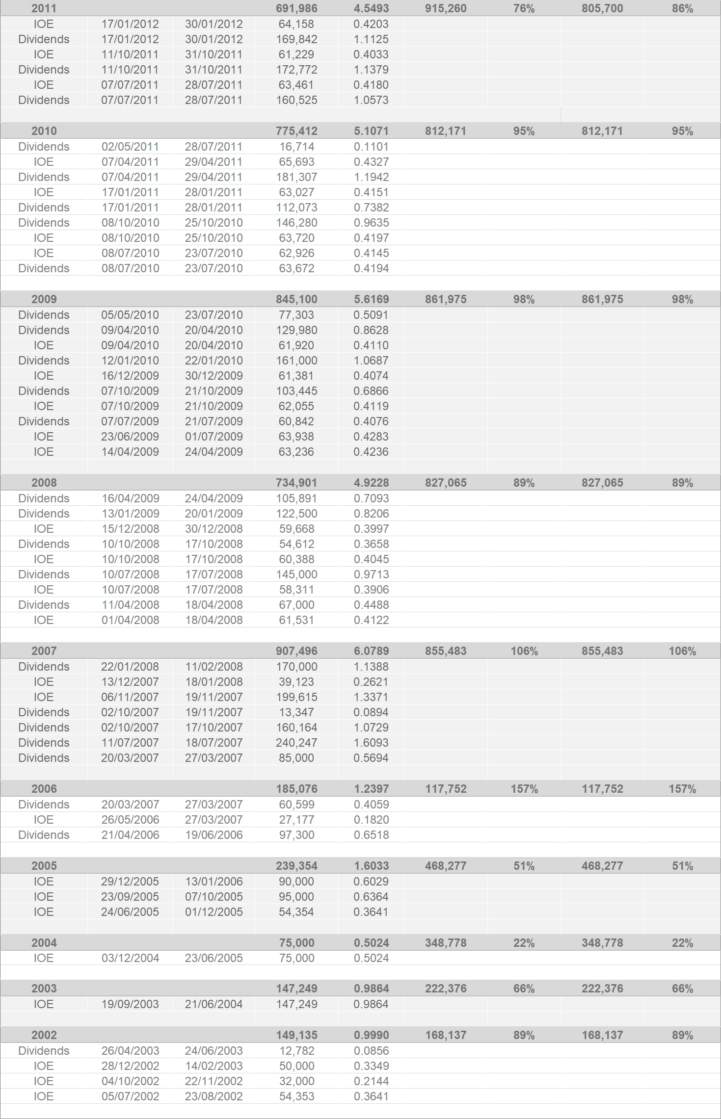 | 2012 | 128.107 | 348.570 | 476.677 | R$ 3,12247 | R$ 2,28330 |