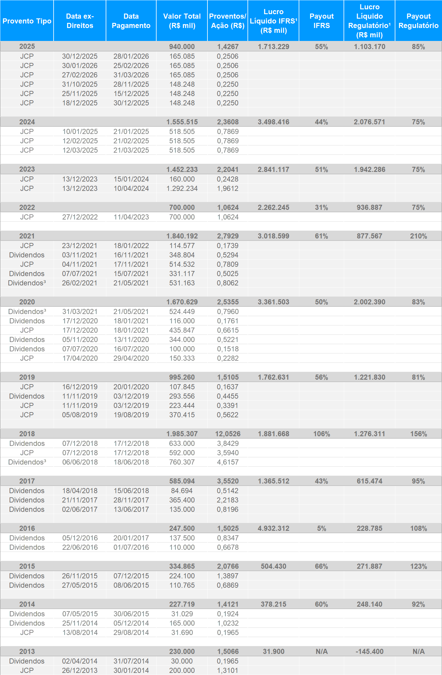 | Juros Sobre Capital Próprio ("JCP") | 19-dez-25 | Resultado do Exercício Social de 2025 | 29-dez-25 | 30-dez-25 | 28-jan-26 | 165,01 | 0,250553 | 0,212970 |