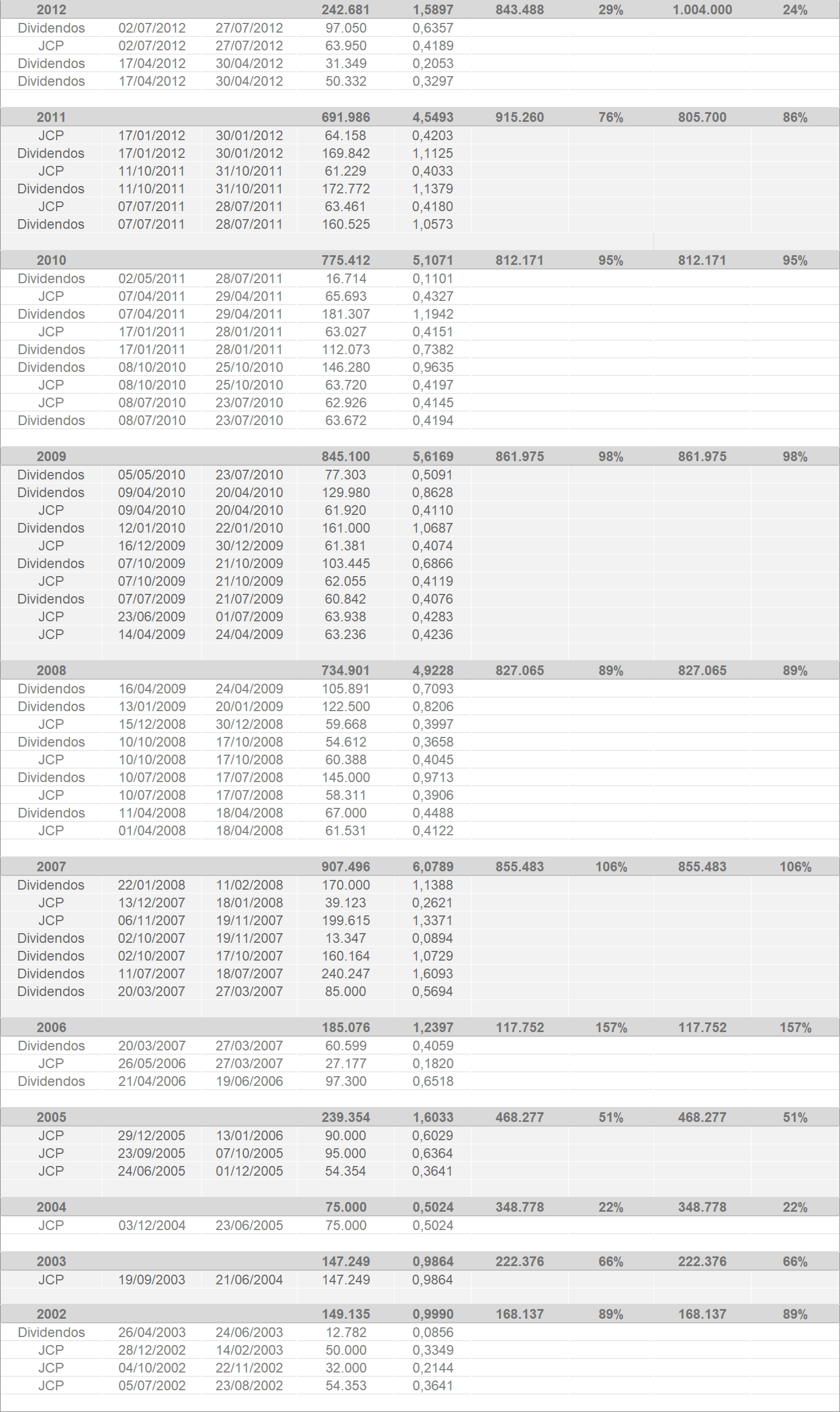| 2012 | 128.107 | 348.570 | 476.677 | R$ 3,12247 | R$ 2,28330 |